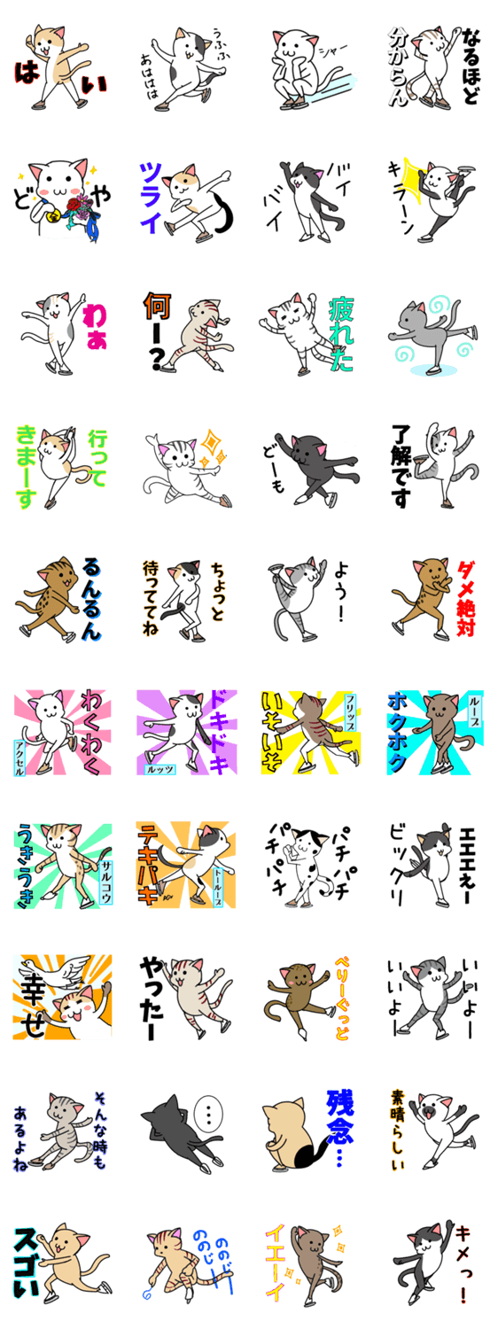 フィギュアスケートの演技をする猫のスタンプですフィギュアスケートの実況にも使えます。共通の趣味の方と使ってフィギュアスケートをもっと楽しみましょう。