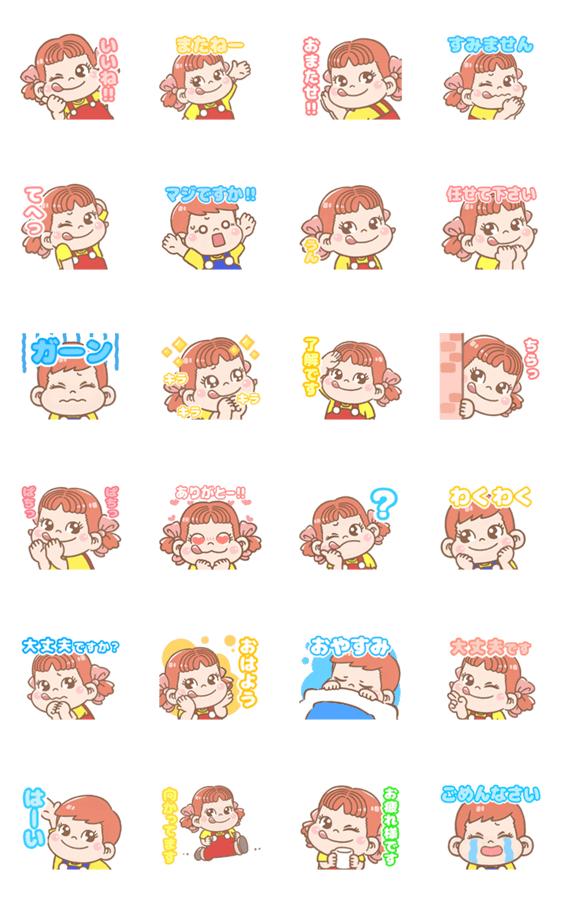 不二家の人気キャラクター、ペコちゃんのかわいいアニメーションスタンプ★キュートでポップにお返事するよ♪