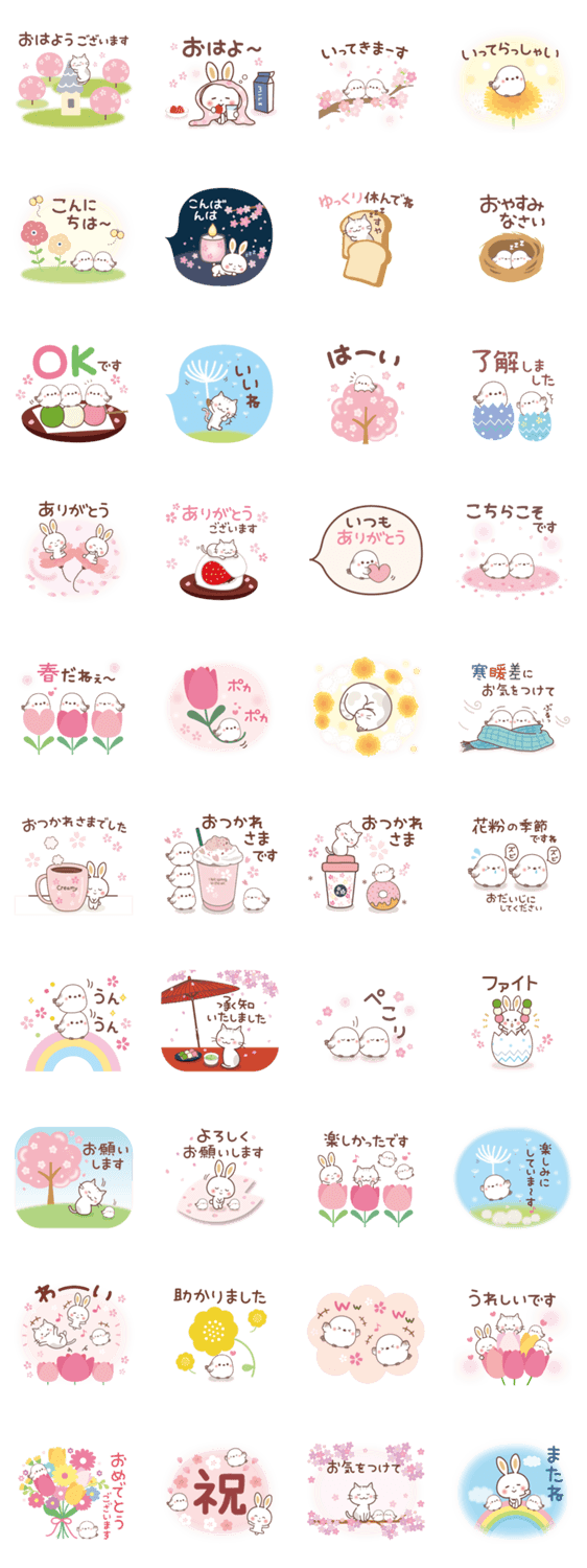 うさぎ・ねこ・シマエナガも登場する[春のコラボスタンプ]だよ♪ 桜や春の花がいっぱいで華やか♪ 春のあいさつや日常トークにぴったり♡毎年使えて便利♪