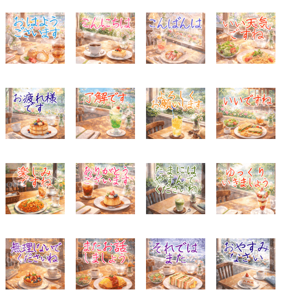 おしゃれなカフェの癒し空間をぎゅっと詰め込んだ挨拶スタンプ。毎日使いやすいワードをそろえています。ほっと心なごむ雰囲気でカフェが大好きな方にもピッタリです♪