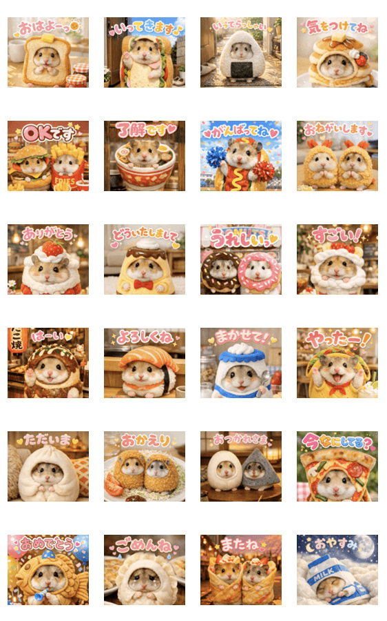 可愛いハムスターが美味しい食べ物になりきって画面いっぱいに飛び出して動く♪ポップアップスタンプです♡