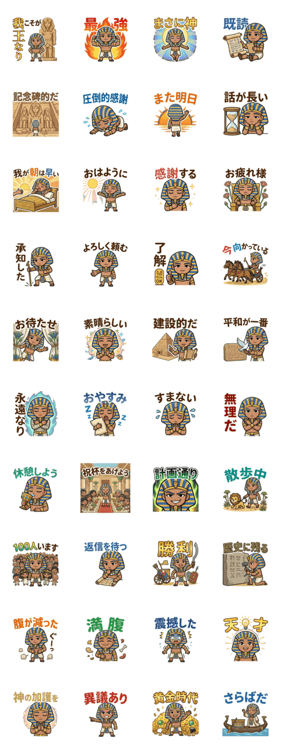 偉大な王ラムセス2世が、ゆるかわキャラに!威厳ある台詞から日常の挨拶まで。最強のファラオがあなたのトークを古代エジプト級に華麗に盛り上げます。