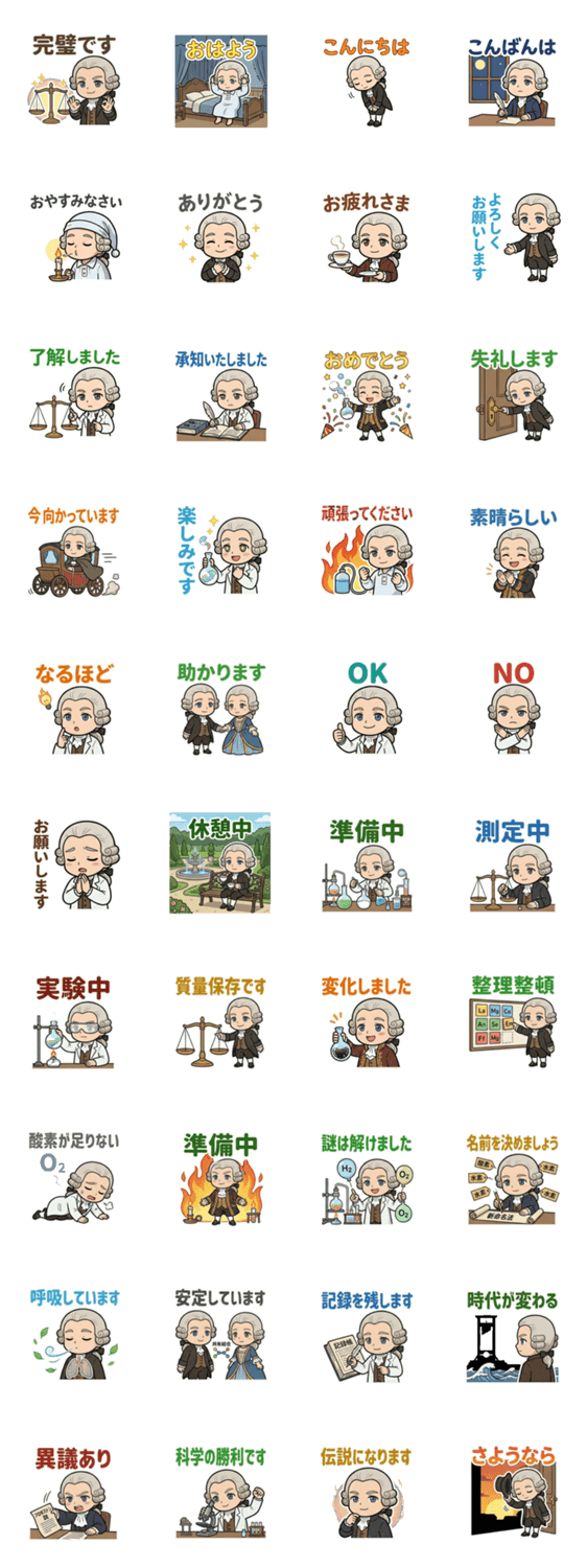近代化学の父ラヴォアジエがゆるかわキャラに!「質量保存」や「実験中」など、科学好き必見のフレーズで日常トークを理論的に、そして可愛く彩ります。