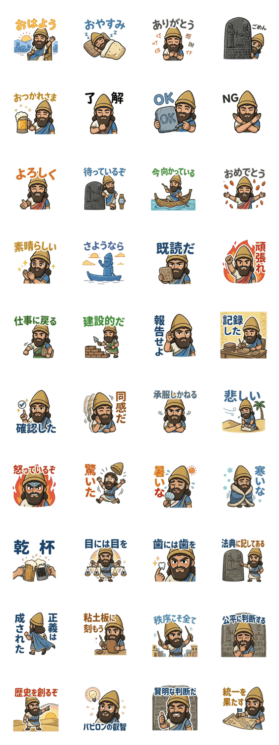 ハンムラビ王がゆるかわキャラに!「目には目を」等の名言を日常で使いやすくアレンジ。古代の叡智と公平な精神で、あなたのトークを平和に導きます。