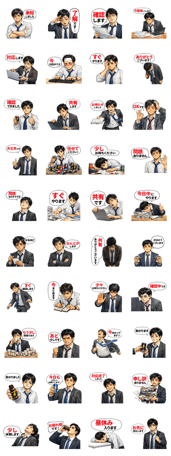 終わらない残業で魂が抜けた社畜男性のスタンプです。疲労、虚無、やる気ゼロ、でも仕事は終わらない。普段の挨拶、既読スルー、愚痴にも使えるリアル全開の一式です。