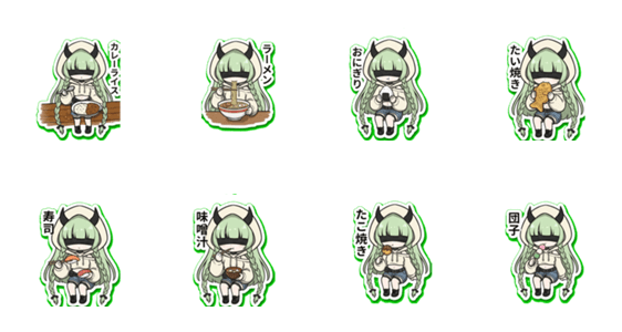 クールな悪魔っ娘「冴木さん」による食べ物紹介スタンプ。挨拶代わりに「カレーライス」「ラーメン」など、美味しそうなメニューを冷静にお届けします。飯テロにも最適!