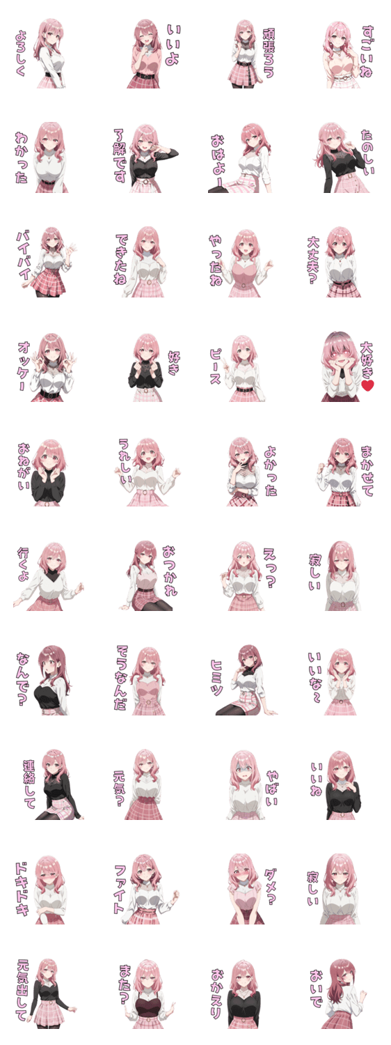 上品で綺麗なのに、行動はちょっと自由。 ピンク髪の大人な女性が、やわらかくてクセのあるリアクションで日常トークを華やかに彩るスタンプです