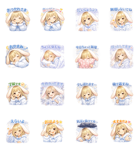 がんばりすぎちゃう毎日に、そっと寄り添う“みるくうさ”のスタンプです 「おつかれさま」「だいじょうぶ?」「ちょっと休むね…」など、やさしく本音を伝えられる言葉