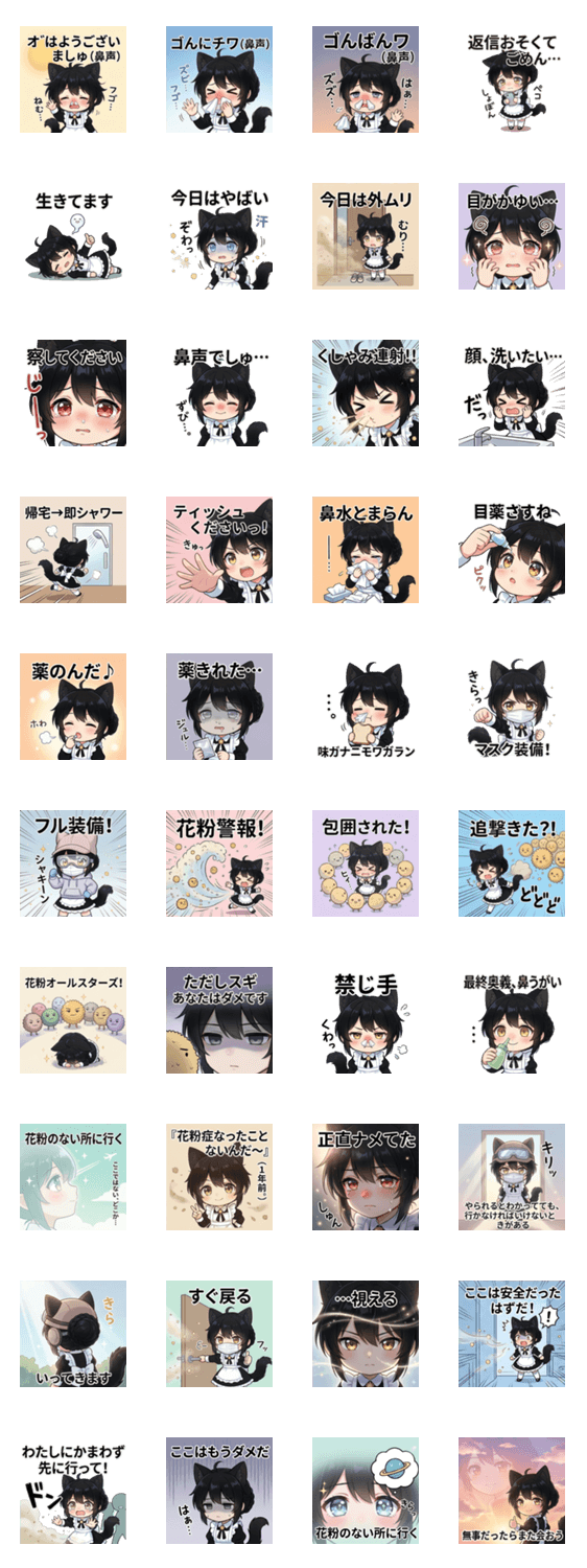 ナナ_WiseOwlLab公式スタンプ_Vol05-07の花粉症シリーズから40種類を厳選して、【花粉症シリーズ統合版】としてワンパッケージに。お好きなシリーズをお手に!