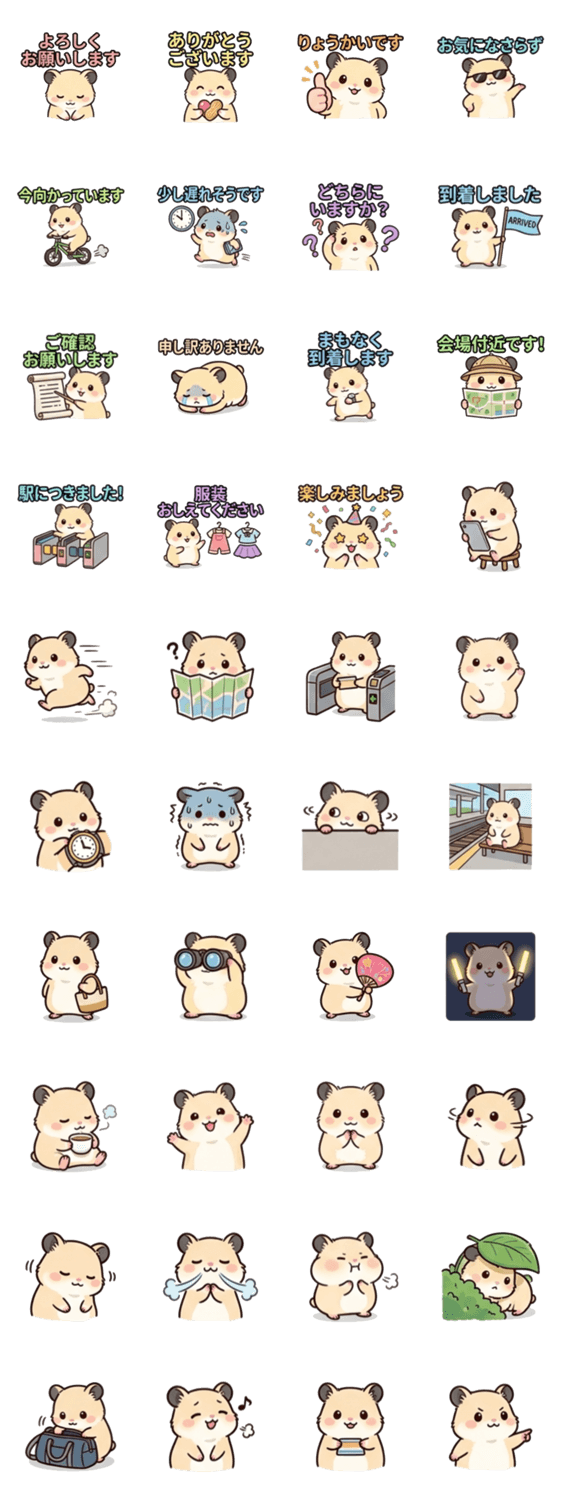 優しいイケハム、ぱやぱや毛のハムスターのうにちゃんの待ち合わせに使えるスタンプです。オタクの皆さん以外にも推し活をしている方やコンサートやイベントにもぜひ。