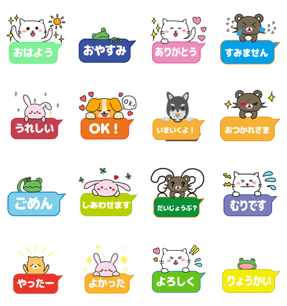 ゆるい動物たちが、吹き出しで気持ちを伝える日常会話スタンプです。あいさつなど毎日使いやすい言葉をそろえ、幅広い世代の方にも見やすいデザインにしました。