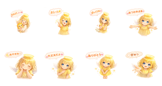 やさしく寄り添う小さな天使「ルミエル」の日常スタンプ。 ほっとする言葉をあなたへ届けます。