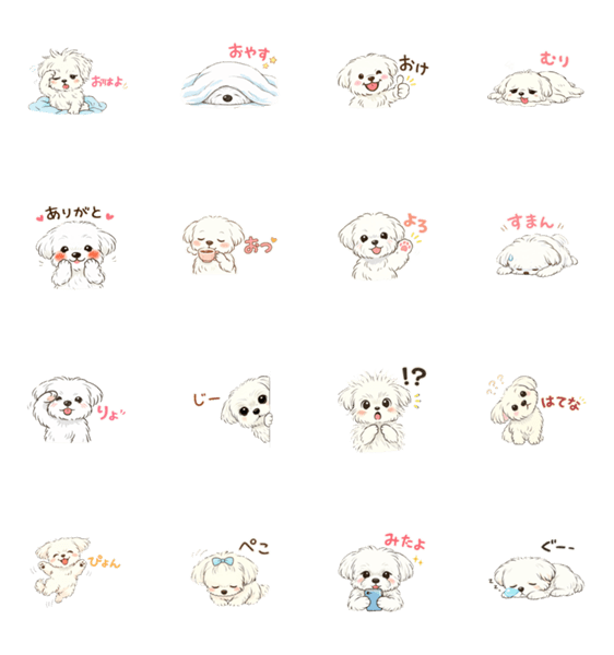 日常のチャットにぴったりのシンプルでラフなスタイルのマルチーズ犬。かわいくて少し面白いこれらのステッカーは、友達に本当の気持ちを伝えるのに最適です!