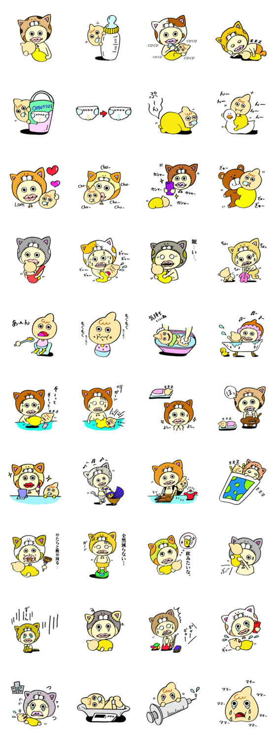 かぶりんシリーズ第二弾!!育児バージョンです。今回は猫かぶりん!育児に奮闘するかぶりんスタンプ登場です。