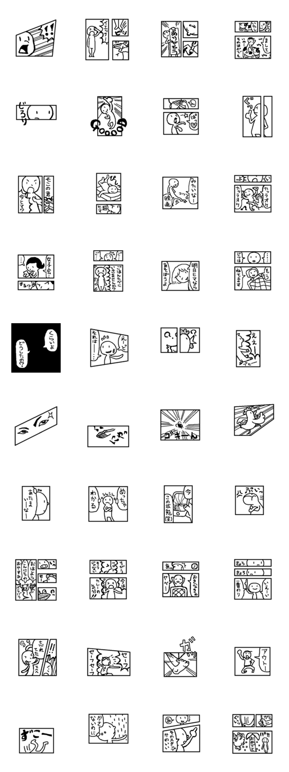 漫画風にコマ割りされたスタンプです。小さくて見づらいですが、その分相手が「なんだこりゃ」と思ってよく見てくれる、ことを期待しています。