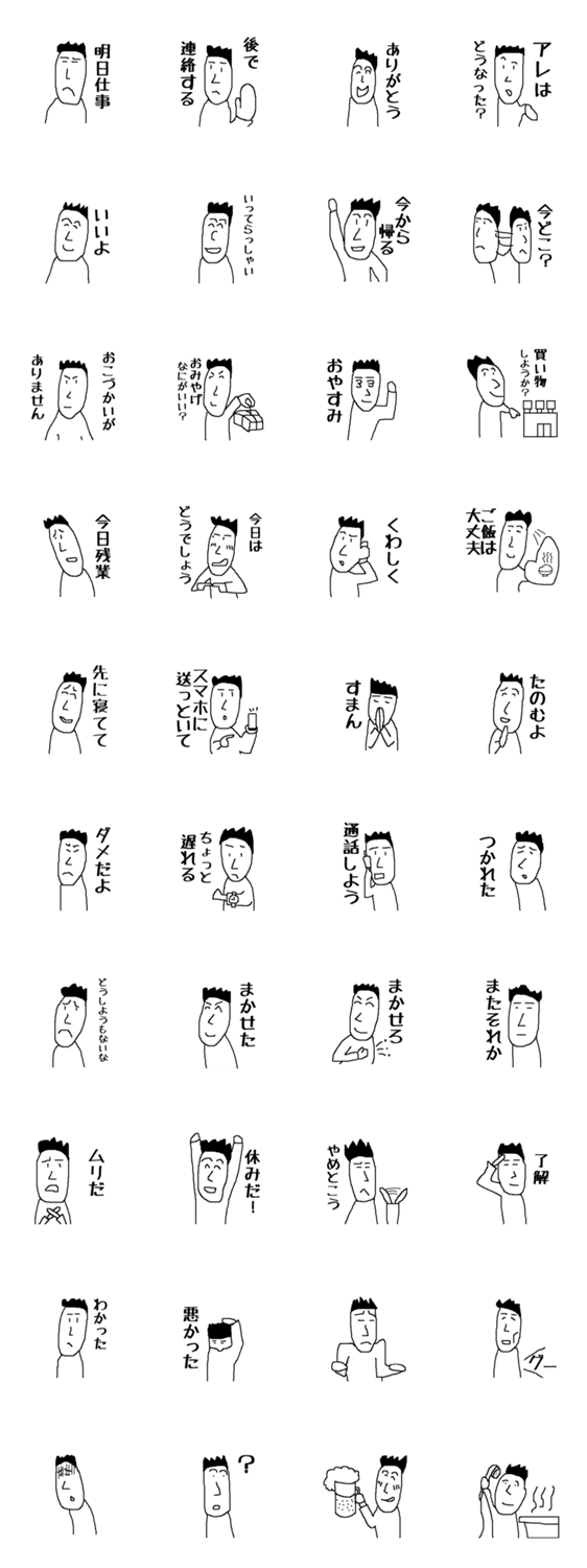 家族あてによく使う言葉を選んだ、ごく普通で平凡なスタンプです。派手・大げさなスタンプを使いたくないときにどうぞ五十音順に並んでいます