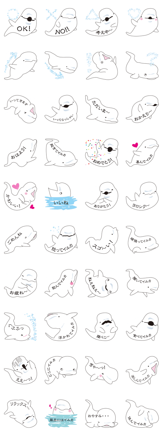 吹き出しになった、かわいいしろいるかだよ!白海豚のにんまり笑えるマッタリポーズで、おめでとうやありがとうの楽しい気持ちが伝わるよ!毎日の挨拶や連絡にも大活躍!