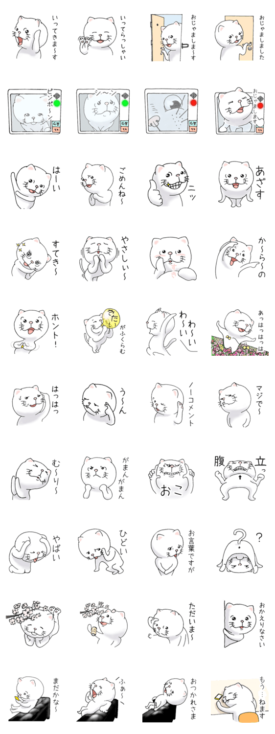 いってきます、いってらっしゃい、ただいま、おかえりなどごくごく日常で使えるゆるいねこのスタンプ。ユーモアも交えてどうでしょう