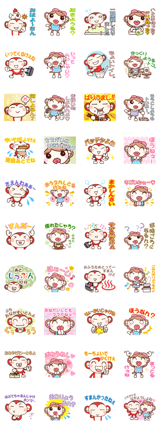 広島弁が標準語の赤いおさるさんに新しく「さる子さん」も加わって、コアな広島弁で日常のやり取り。家族、親子、友達、恋人、夫婦、いろんな人とやり取りできます。