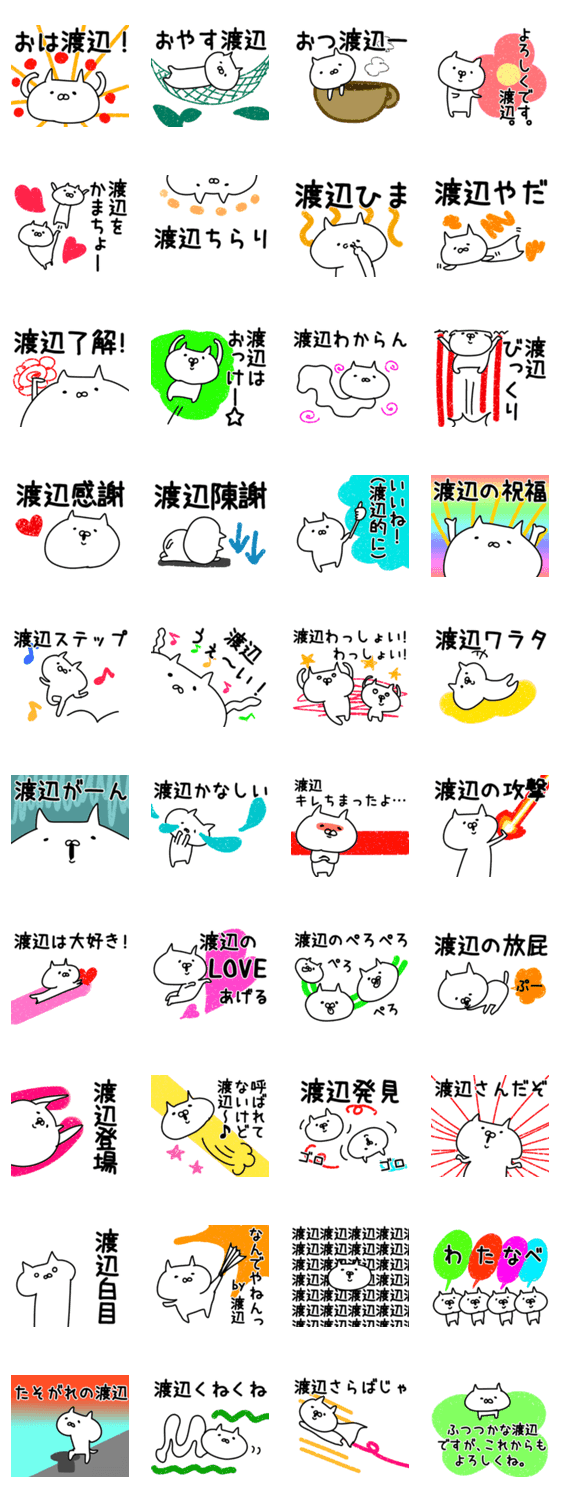 渡辺さんが使う用のネコの名前スタンプです。ゆるいねこなので、気負わず使えるよ。名字がわたなべさんの人はこの猫スタンプを送るべし。
