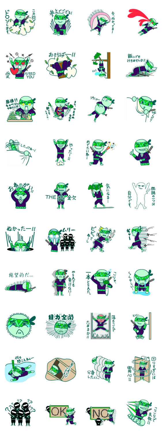 ”あつやきたまご”第2作品目のスタンプです。今回は、アオミドロをもじって作りました!ゆるい忍者が会話を楽しく盛り上げます。では、この辺でドロンします!