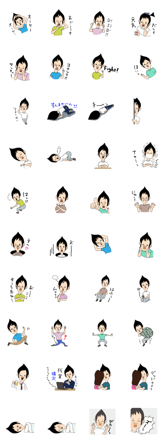 とんがり頭と、色とりどりのTシャツからしみた脇汗がトレードマーク!じわっとくる面白系なスタンプです。