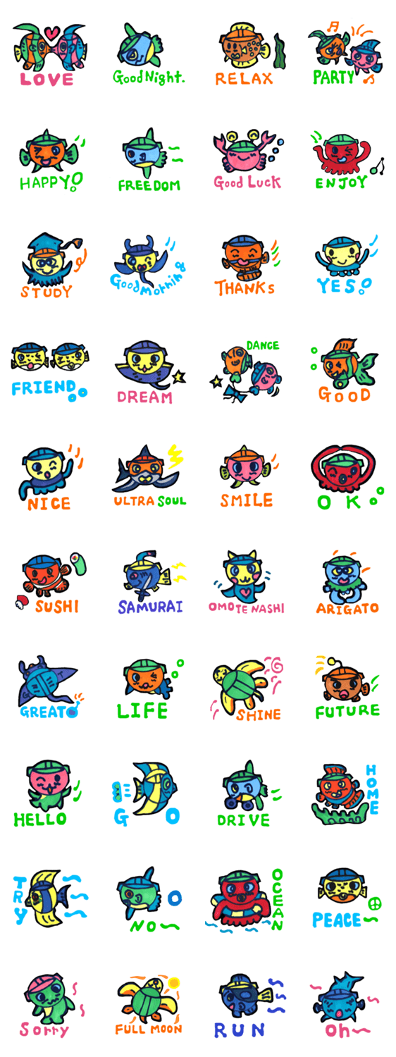 ヘルメットをかぶった海の仲間たち。キュートでカラフルなスタンプです。日常会話で使用してお楽しみ下さい。