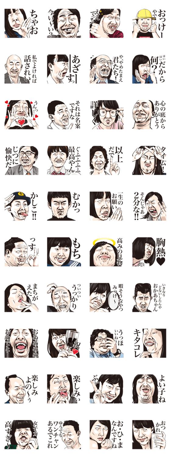 老若男女、様々な人達の白目やウザ顔やキモ顔などで破壊力満点な攻撃ができる変顔スタンプです。新たな攻撃に君の仲間は対応できるのか!?しろめ爆弾のスタンプ69作。