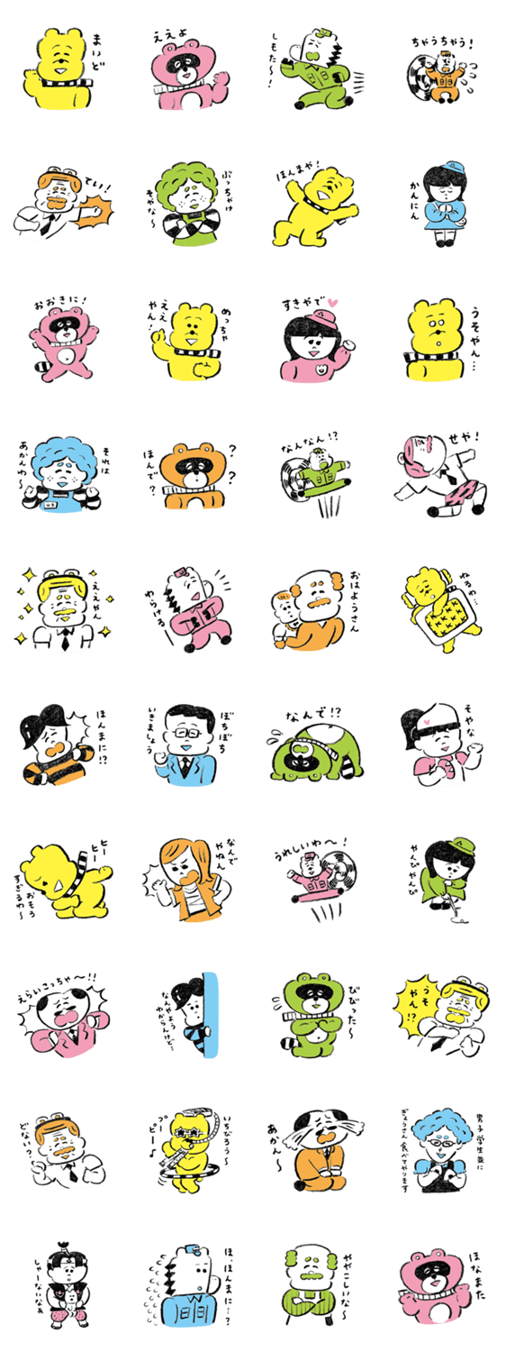 『かんさい絵ことば辞典』のスタンプ登場!くまのうちくんや、ちょけ部長などのキャラクターがトークを楽しませてくれます。全てに「かんさい弁」のセリフ付き。