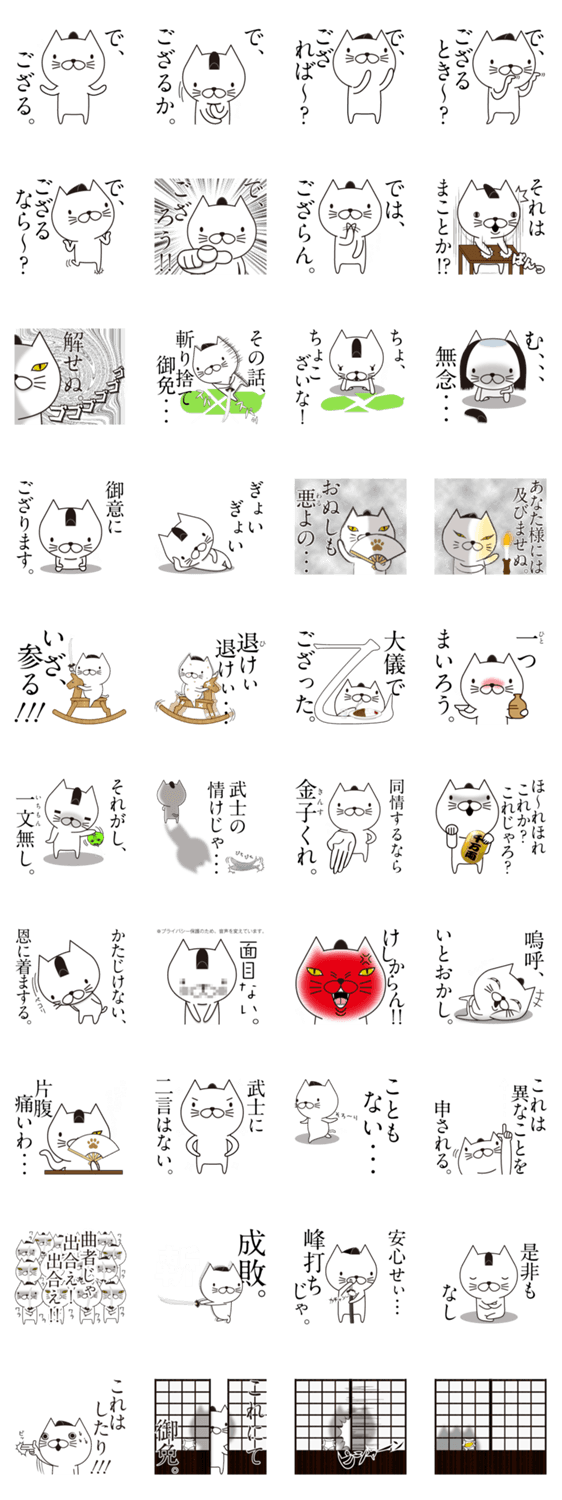 武士語を話す猫侍のスタンプです。カワイくてシュールなねこが武士語でトークを盛り上げます。