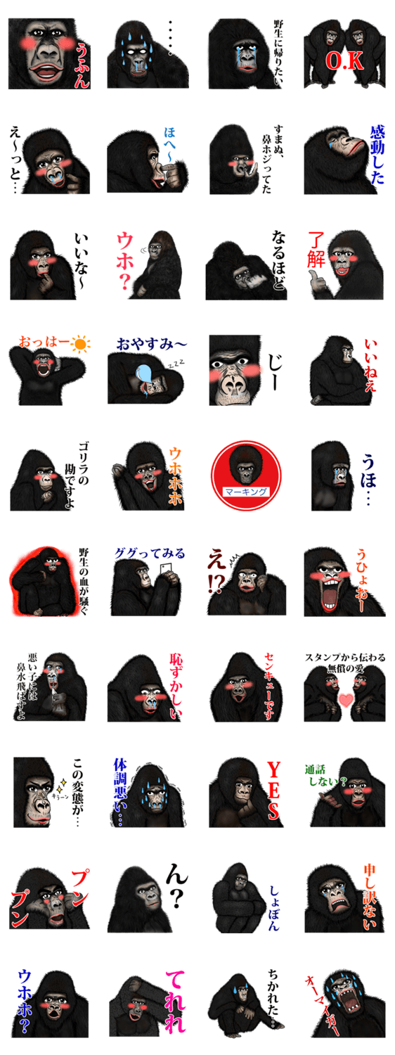 個性豊かなゴリラ達のスタンプ。