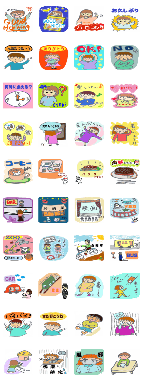 挨拶や食べ物、場所や乗り物を作りました。会う約束の時に使ってもらえれば嬉しいです。