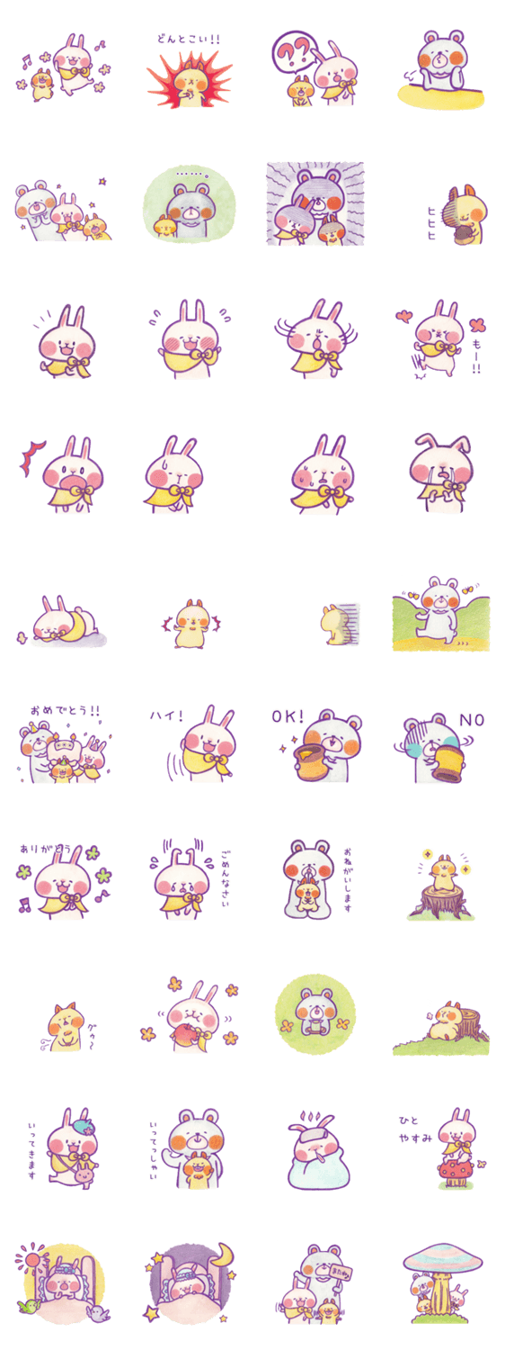 黄色いケープうさぎと仲良しの仲間たち。シニカルハムスターとノンビリストなくま。ほんわり手描きスタンプです。