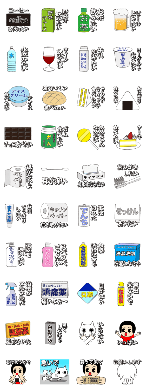 今欲しい必要な物資をお願いするのに便利なスタンプです。どうしても身動きが取れないような時、お買い物のお手伝いを頼みたい時に使ってみましょう。