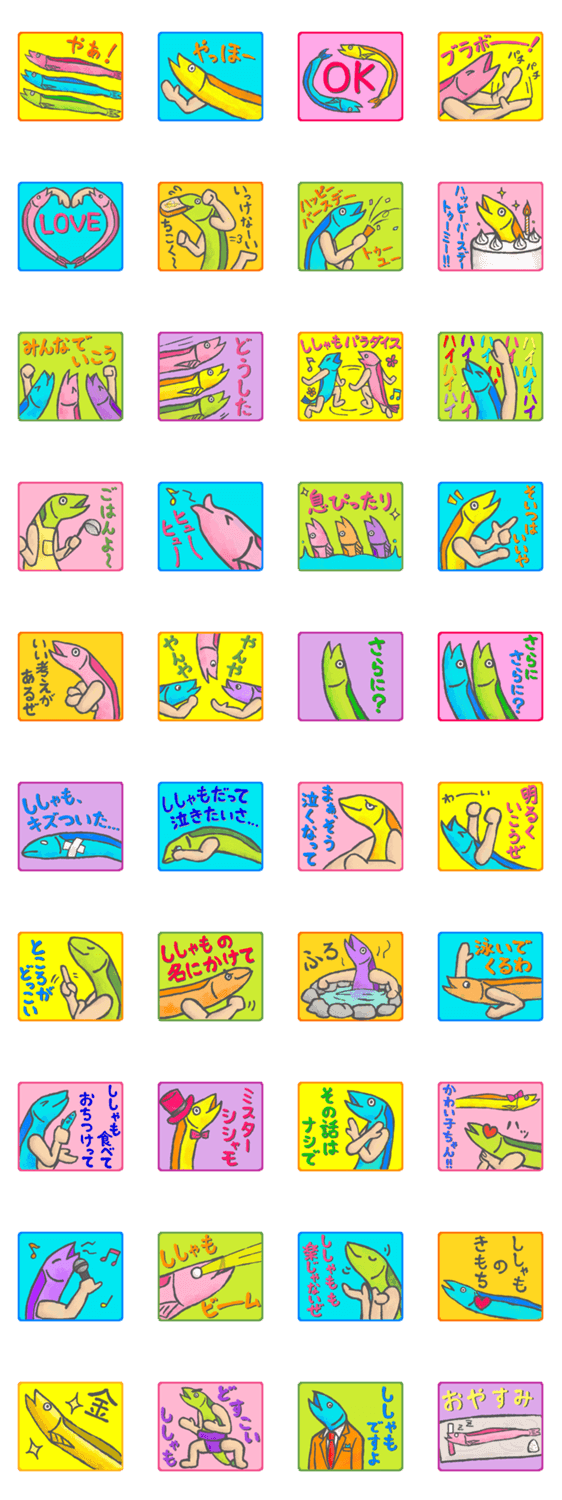 とにかくカラフルでハイテンションなシシャモたちのスタンプです。