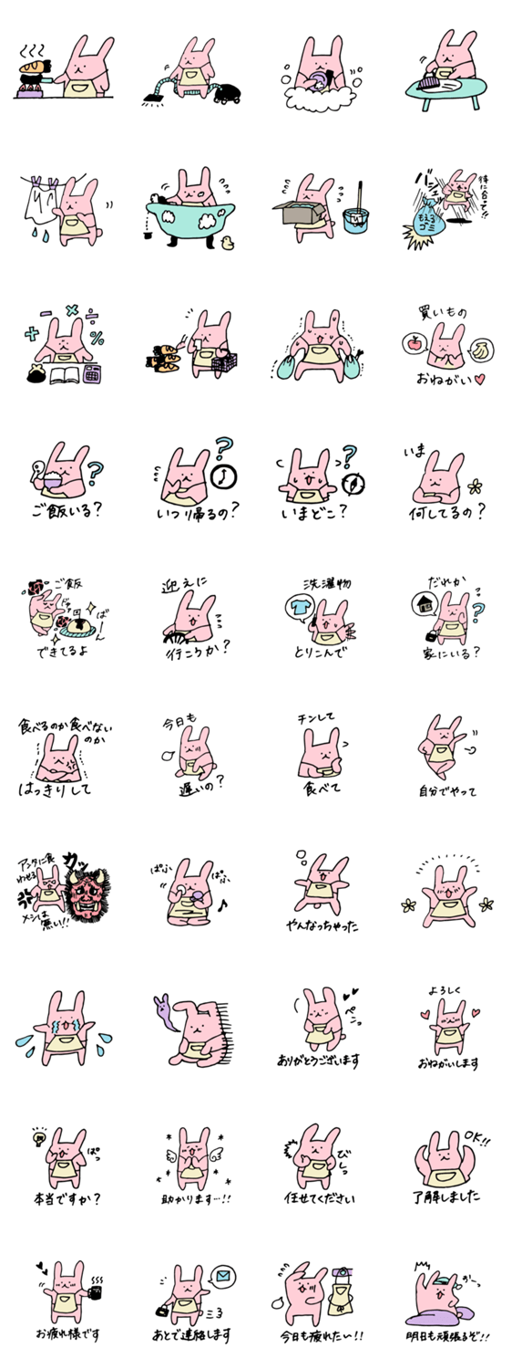 家事をするうさちゃん他、旦那や家族への連絡用、お友達にも使える敬語スタンプもはいっています。