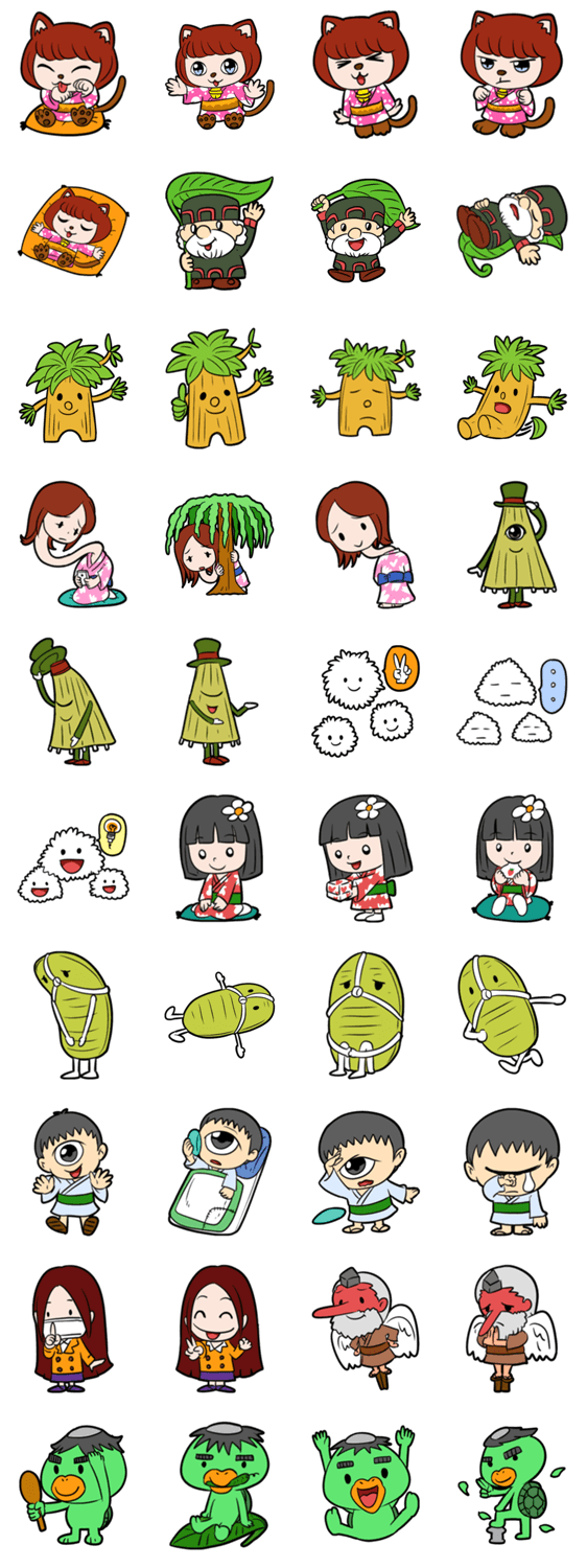 日本の妖怪や精霊のスタンプです。座敷童子、猫又、キムジナー、ケサランパサラン、コロポックル、口裂け女、ろくろっ首などがいます。