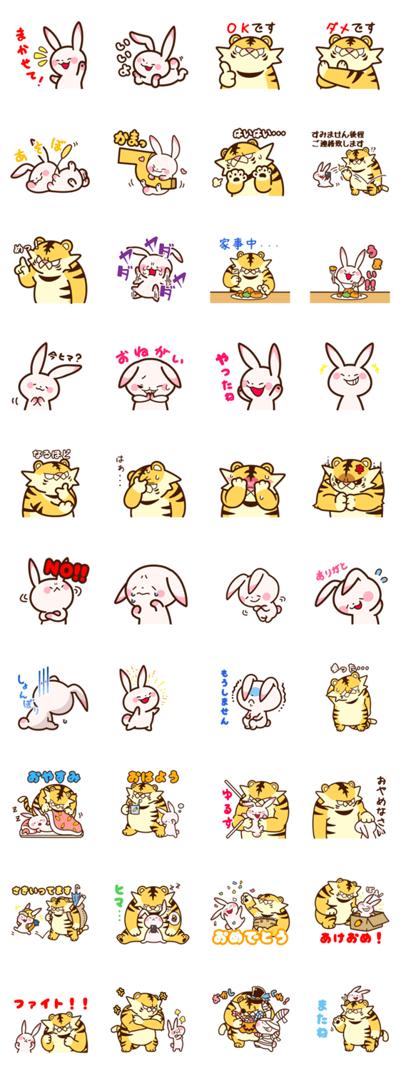 イタズラ好きなうさぎのラビとトラの日常スタンプ。友達がスタンプを連打してきたら「おやめなさい」で止めよう。