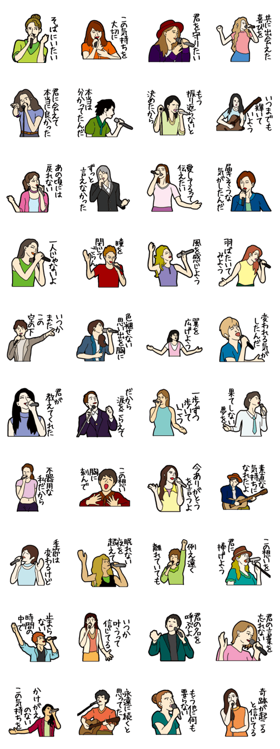 J-POPの歌詞に登場しそうなフレーズがスタンプになりました。うまく繋げて使えば相手に歌を届ける事も可能です。かけがえのない君に大切な言葉を今伝えたい。そんな時に。