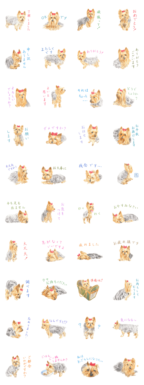 日常で使える敬語を中心とした、小型犬ヨークシャーテリアの色鉛筆画スタンプです。