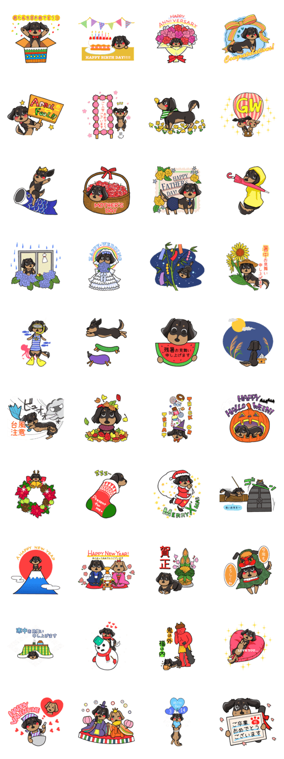 | スタンプ説明 | お正月/バレンタイン/入学卒業/母の日/父の日/ハロウィン/クリスマス/年中行事・イベントから春夏秋冬の季節、誕生日や結婚式のお祝いに使えて便利!ダックスフント大好き! |