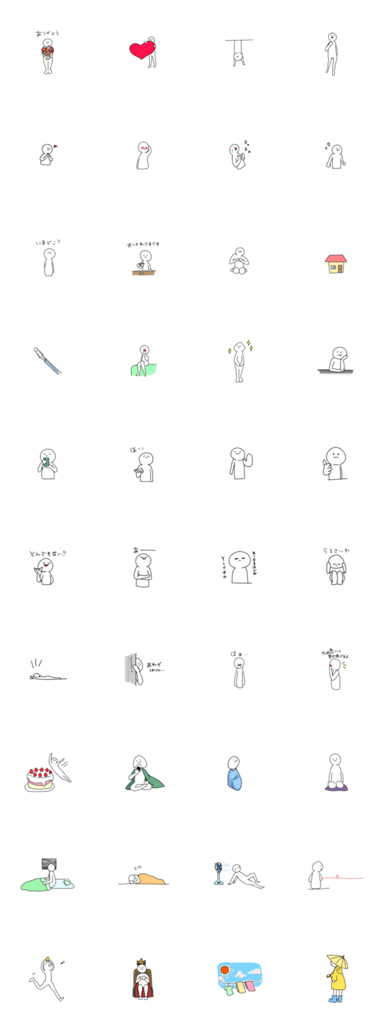 線の細い白い人のスタンプです。ありきたりなキャラクターです。白く縁どりされているのでシールみたいにどんな背景でも貼れます。サイズは小さめ〜中くらいのもの。