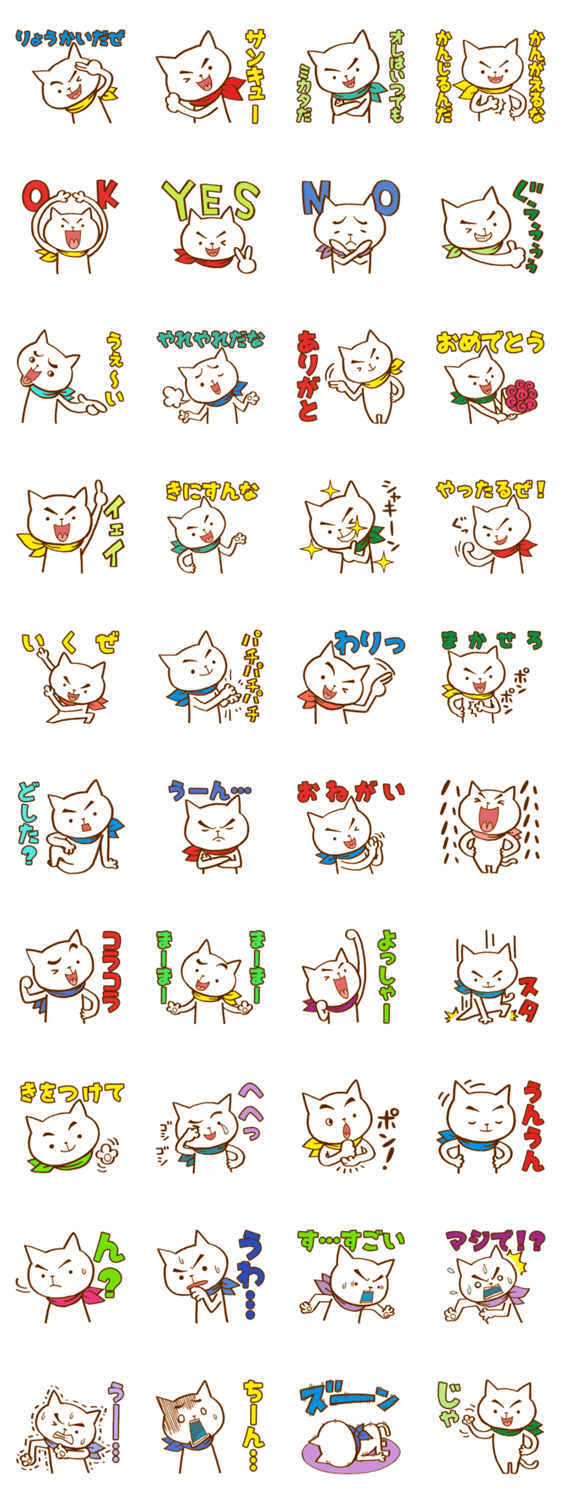 眉毛がイカした、男前な猫のスタンプですシャキッ!カラフルなスカーフでオシャレにキメて、実は結構お調子者のハンサムガイなねこさん、かわいがってほしいなシュタッ!