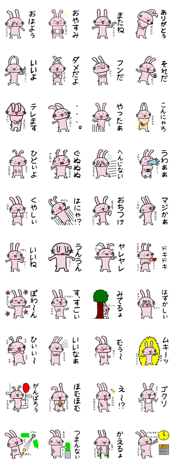 よくあるやり取りを取り入れました。主に家族や友達とのやり取りに使えます。意味もなく頬が赤いうさぎのスタンプです。