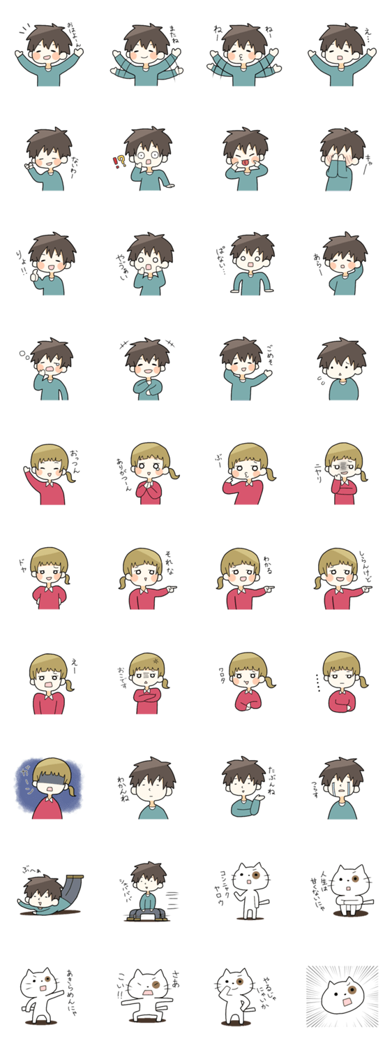 そんなかんじの男の子と女の子と猫のスタンプです。