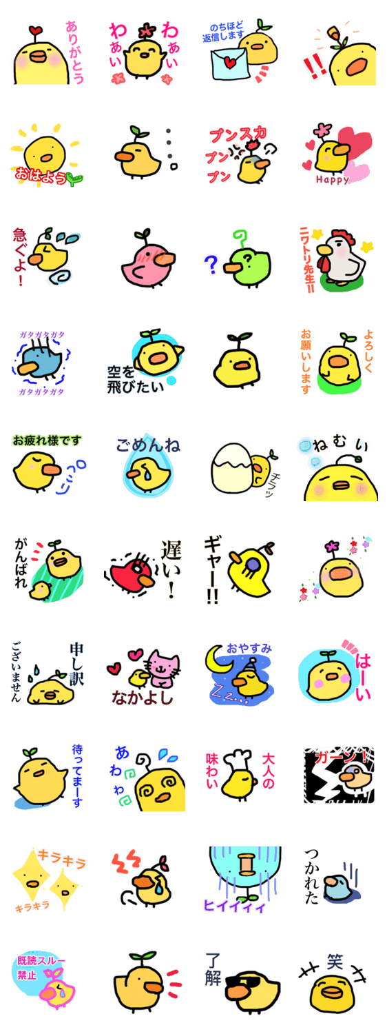 頭に草が生えているひよこです。感情によって何の草が生えるか決まります。このスタンプで日常会話に花を咲かせてください。