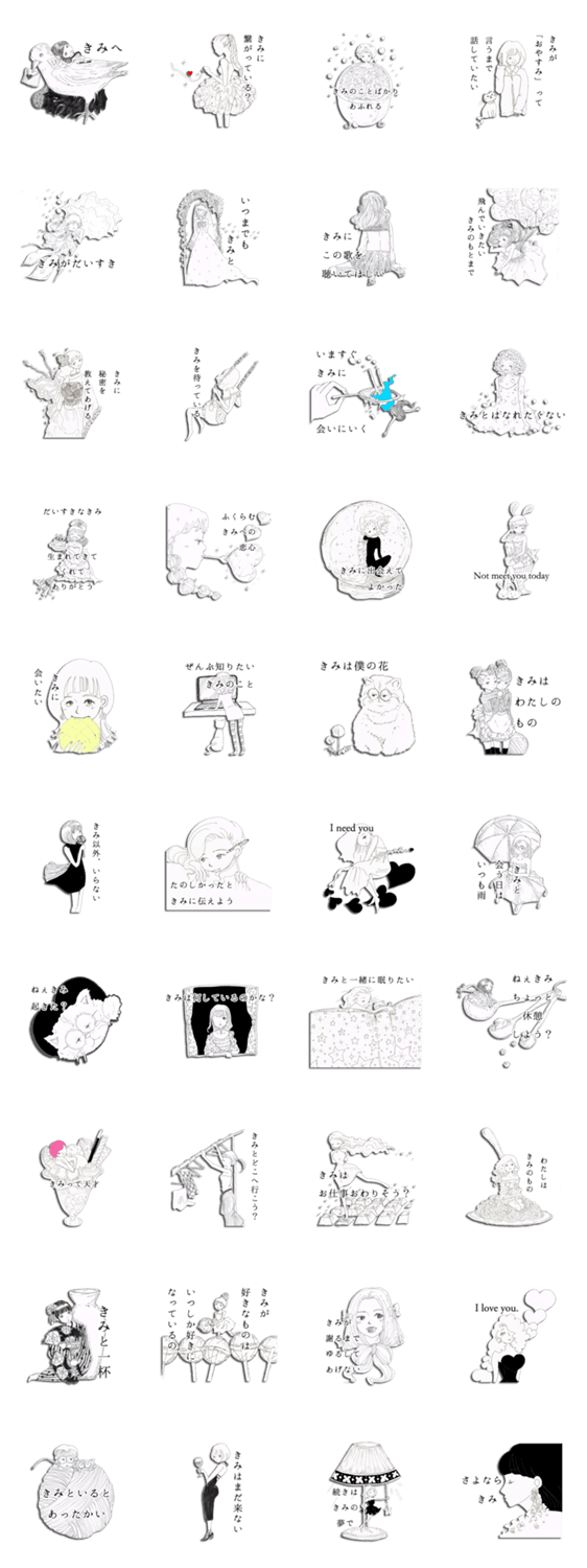 モノクロで描かれた女の子たち(&猫)大好きな人へ、このスタンプを送って、ラブラブになってほしい!という願いを込めて――恋愛小説家の姉と、絵描きの妹が作りました。
