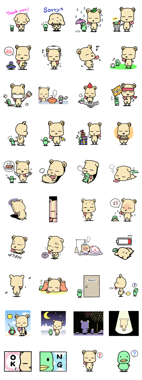 いつも舌を出している『ぺろクマ』と、お供の謎の生き物とのスタンプです。