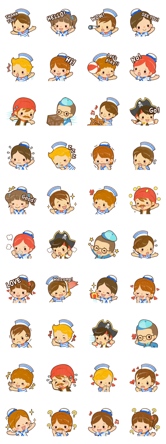海賊や水夫の子どもたちのスタンプです。恋愛や会話、誕生日などに使えるリアクションが多いです。爽やかな印象があっておしゃれに使ってくれると嬉しいです。