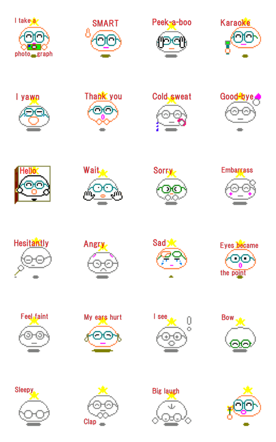 アニメーションスタンプです。表情を表現しました。それぞれの素材には、意味がわかるように表記を入れました